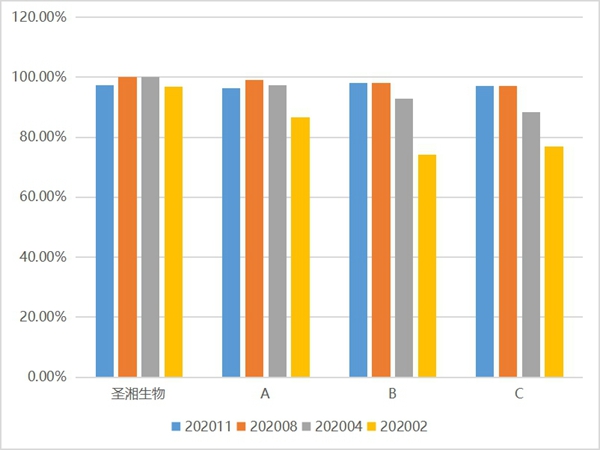 可以看出,yabo鸭脖官网生物的新型冠状病毒核酸检测试剂在检测不同浓度阳性样本时,均具备较高的符合率;尤其是对第一次2020002号640copies/mL浓度样本、第二次202009号3.5X103 copies/mL浓度样本的检出率,远超其他主流厂家。